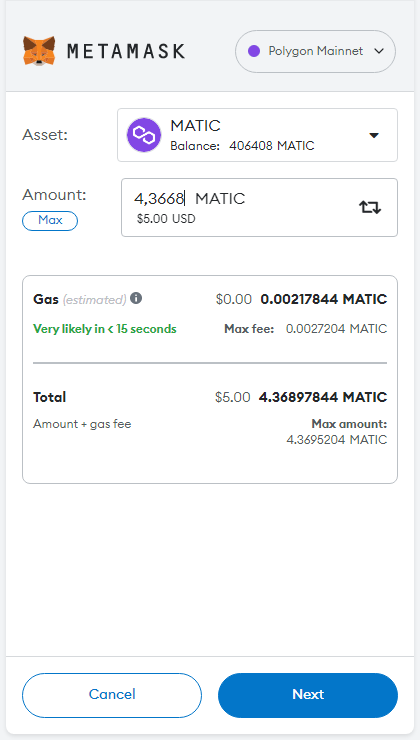 A sample calculation in MataMask wallet of $5 worth of MATIC.